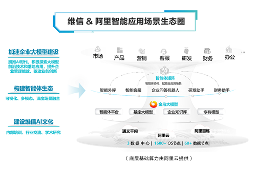 维信金科一直将科技创新视为企业发展的核心驱动力。早在2023年,维信金科便率先启动垂类大模型研发,如今已构建起以头部大模型为引擎、自主创新为核心的技术体系。依托与阿里云的紧密合作,维信金科以阿里云底层算力为支撑,深度整合通义千问、阿里百炼等能力,打造智能应用场景生态圈,覆盖市场、产品、财务、办公、营销、客服、研发等多个维度,为企业数字化升级提供安全、高效的解决方案。